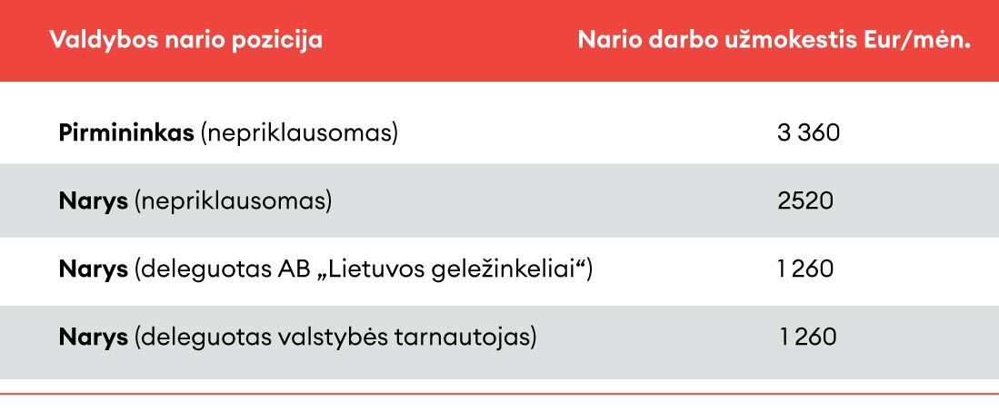 Valdybos narių atlygis, apskaičiuotas remiantis įmonės generalinio direktoriaus vidutinio darbo užmokesčio dydžiu, yra nustatytas vienintelio Bendrovės akcininko sprendimu ir mokamas pagal faktiškai dirbtą laiką. Valdybos narių atlygis yra: