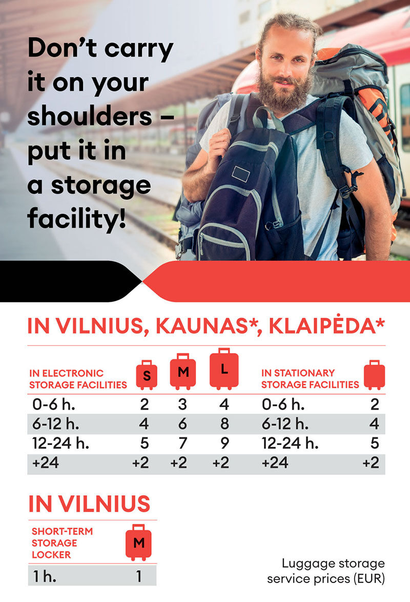 As you know, for your convenience, the railway stations of Vilnius, Kaunas and Klaipėda have electronic luggage storage facilities, where you can leave your belongings and continue your journey with peace of mind and much more mobility!
