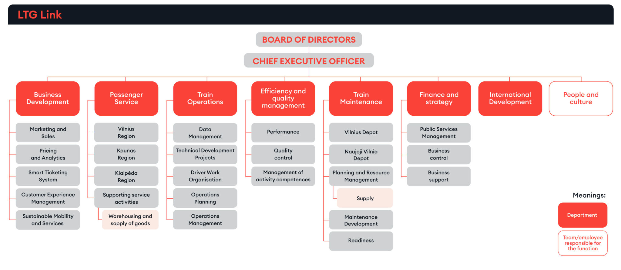 The General Meeting of Shareholders is the supreme governing body of the Company. The competence of the General Meeting of Shareholders, the procedure for convening and adopting decisions are laid down in the Law on Companies, other legal acts, as well as in the Articles of Association of the Company. The sole shareholder of UAB LTG Link is AB Lietuvos geležinkeliai, which takes the main decisions related to the implementation of ownership rights and obligations.