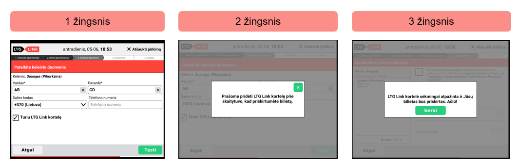 - įsigyti naują Kortelę ir teirautis dėl turėtų terminuotų bilietų duomenų perkėlimo iš senosios Kortelės į naująją, nurodant savo vardą, pavardę, gimimo datą ir adresą bei naujosios Kortelės numerį skambinant telefonu 8 700 55 111 darbo valandomis (7.00–21.00) arba rašant laišką el. paštu informacija@ltglink.lt. Duomenys perkeliami per 3–5 darbo dienas. Perkėlus duomenis, terminuoto bilieto galiojimo terminas nepratęsiamas.