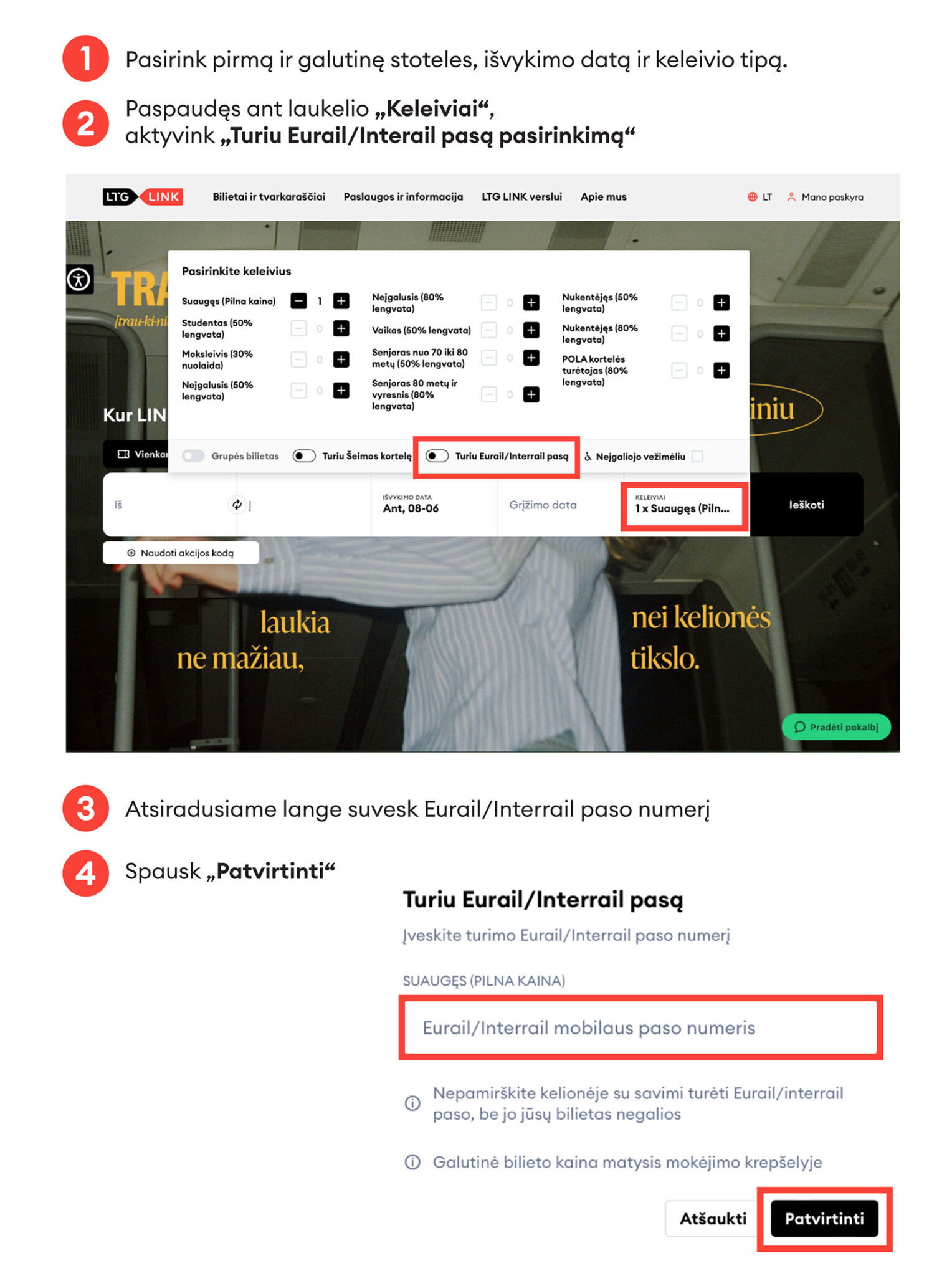 Vietos rezervuojamos www.ltglink.lt, LTG Link programėlėje, kasose bei traukiniuose kelionės palydovų.