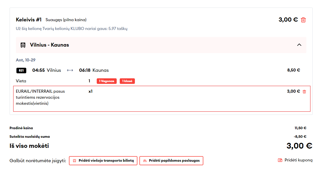 - Vilnius–Klaipėda–Vilnius (3 klasėje rezervacijos mokestis – 3 Eur);
