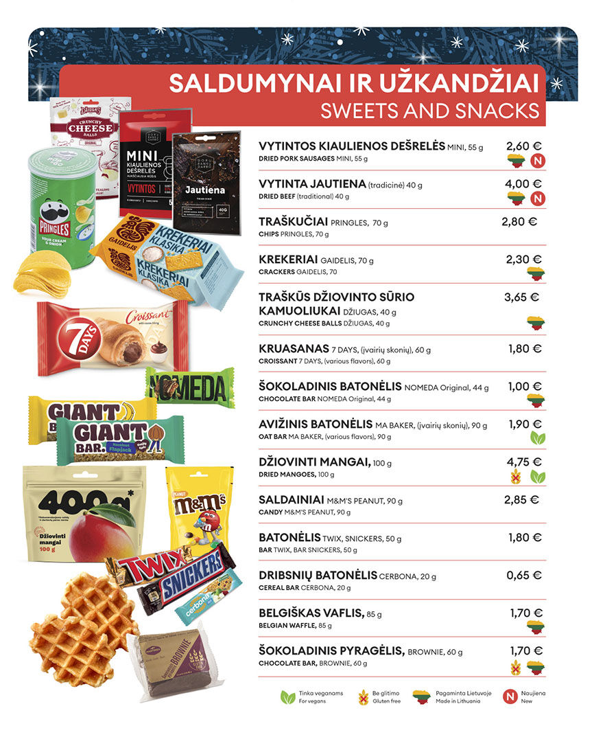 Standartinis MENIU, kurį rasi maršrute VILNIUS–TURMANTAS–VILNIUS.