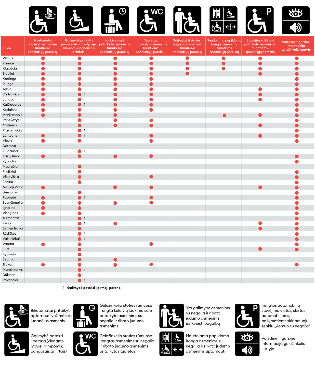 * Kiekvienu kelionės planavimo atveju rekomenduojame susisiekti su keleivių informacijos centru telefonu +370 700 55111 ir pasidomėti, ar specialiai Jūsų poreikiams pritaikytas traukinys važiuos konkrečią dieną ir valandą.** Patekimo į traukinį ir išlipimo iš jo paslauga dėl infrastruktūros ar konstrukcinių ypatumų nėra galima 620M, DR1AMv, RA-2 traukinių modeliuose. Kiekvienu kelionės planavimo atveju rekomenduojame susisiekti su klientų informacijos centru telefonu +370 700 55111 ir pasidomėti, kokios galimybės patekti į traukinį ir iš jo išlipti Jūsų planuojamos kelionės pradinėje ir galinėje stotyse.