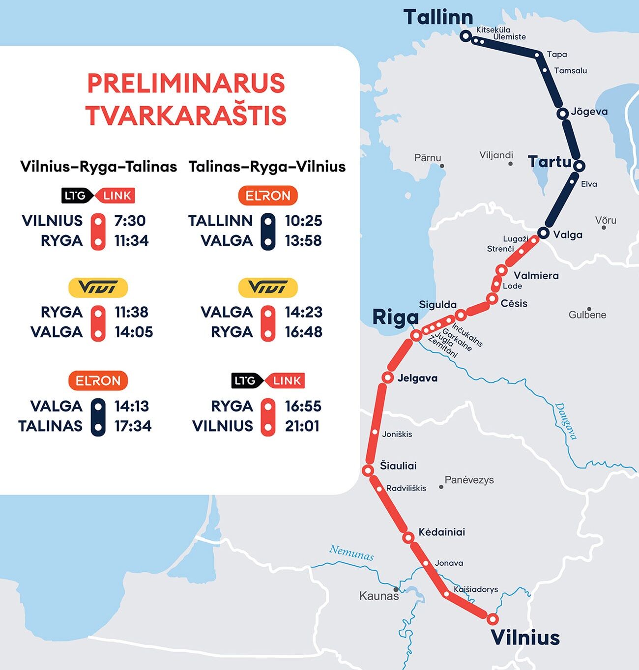 - Reisas Vilnius–Talinas–Vilnius vykdomas su persėdimu Valgos geležinkelio stotyje (Estija).