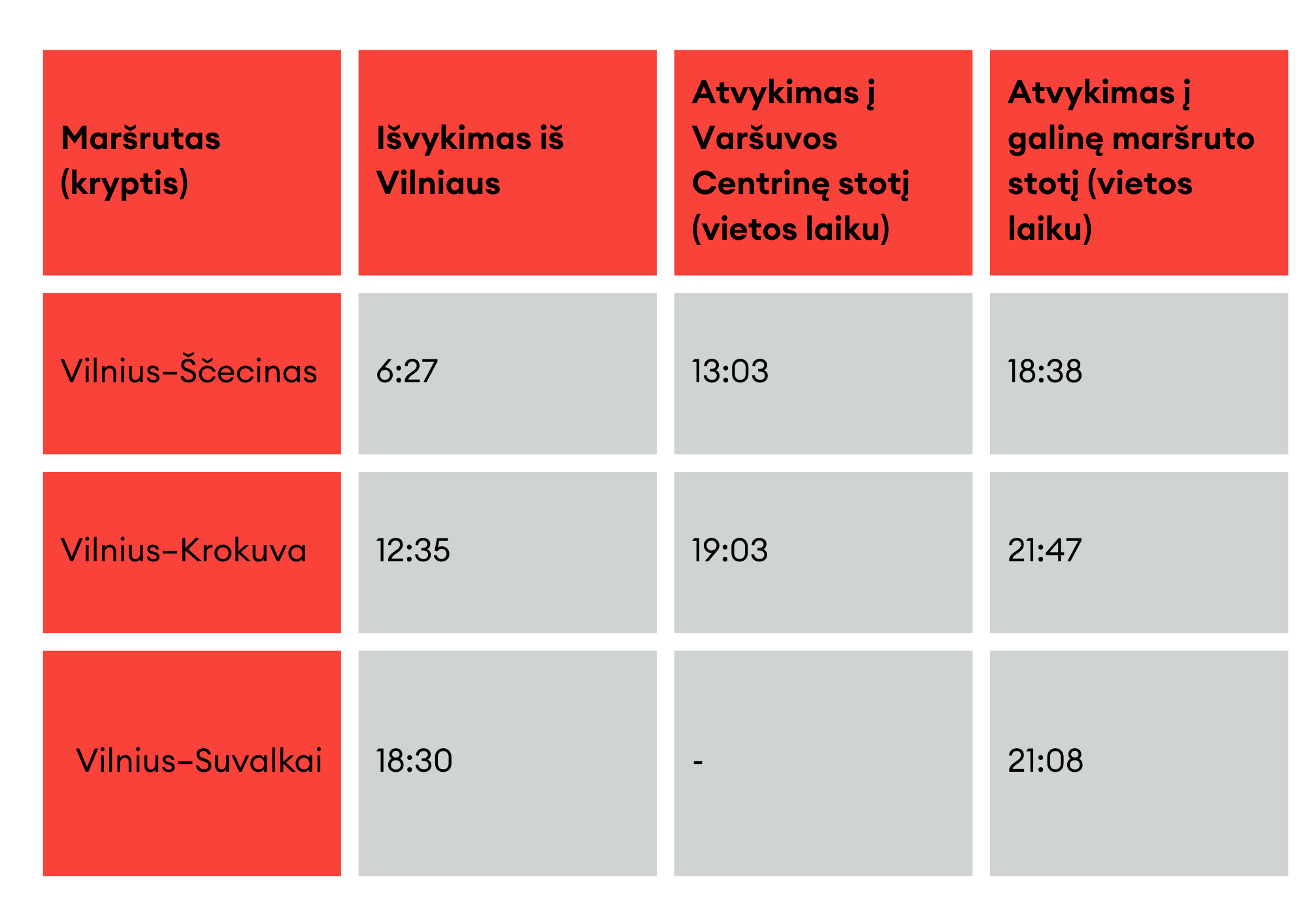 Kelionės metu yra 2 ilgesni sustojimai Suvalkuose ir Balstogėje, kurie numatyti pagal tvarkaraštį ir yra būtini dėl technologinių priežasčių.