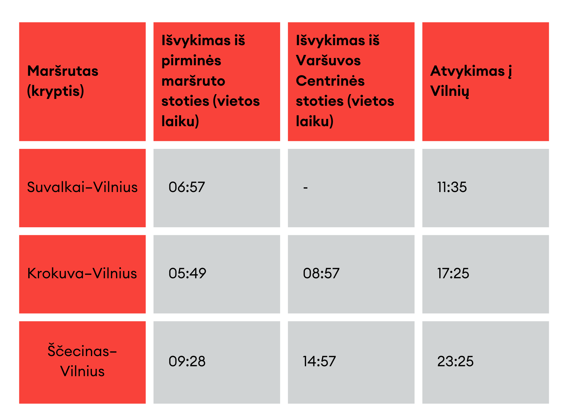Prie esamo maršruto į Krokuvą siūlomas naujas maršrutas į Ščeciną ir suprojektuota papildoma jungtis su Suvalkais. Įsigaliojus šioms naujovėms, keleiviai turės galimybę Varšuvą pasiekti du kartus per dieną, o kelionės trukmė tarp sostinių sumažės -1 h (bus 7h 30 min), tarp Vilniaus ir Krokuvos sutrumpės net - 2h 05 min (bus 10h 12min). Traukiniai važiuos šiais maršrutais: