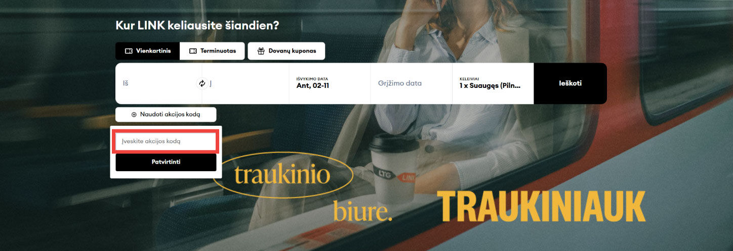 Norėdamas pasinaudoti nuolaidos kodu, jį įrašyk jau pirmajame traukinio bilietų įsigijimo žingsnyje.